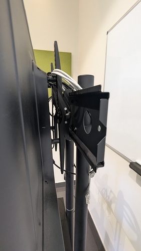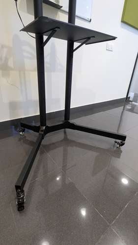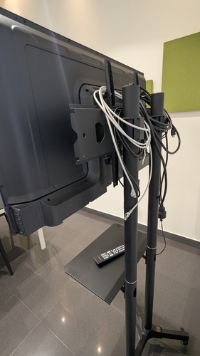 Este soporte para TV cuenta con una base muy estable y ruedas para facilitar su movilidad. Incluye una bandeja para colocar dispositivos.